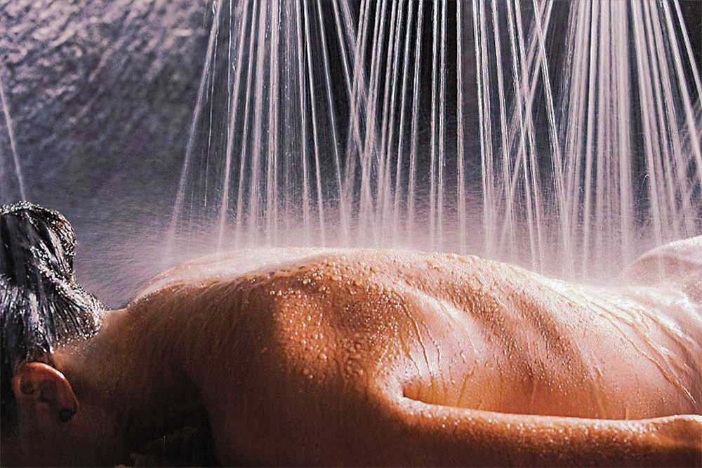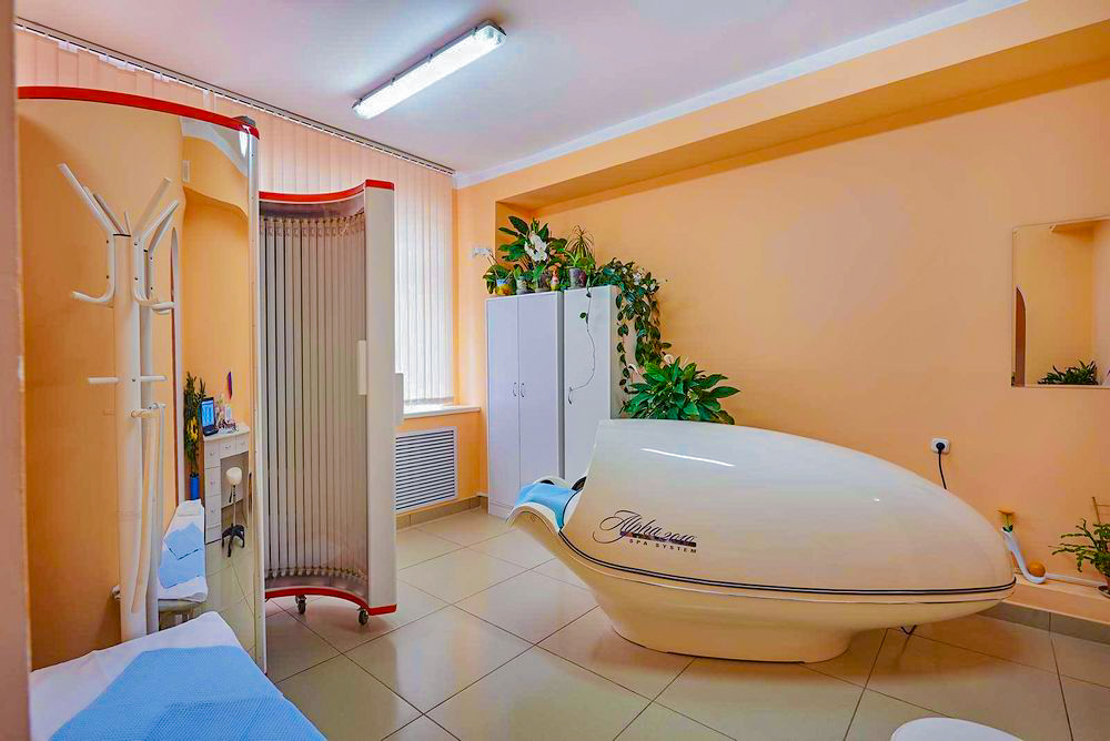 С другой стороны релакс-зоны благоустроен уютный уголок в лаконичном стиле. Там стоят яркие удобные диваны с миниатюрными подушками. Рядом находятся журнальные столики и живые растения, придающие обстановке экологичность и свежесть. Такая атмосфера создана для душевных бесед или спокойных перерывов между оздоровительными процедурами.